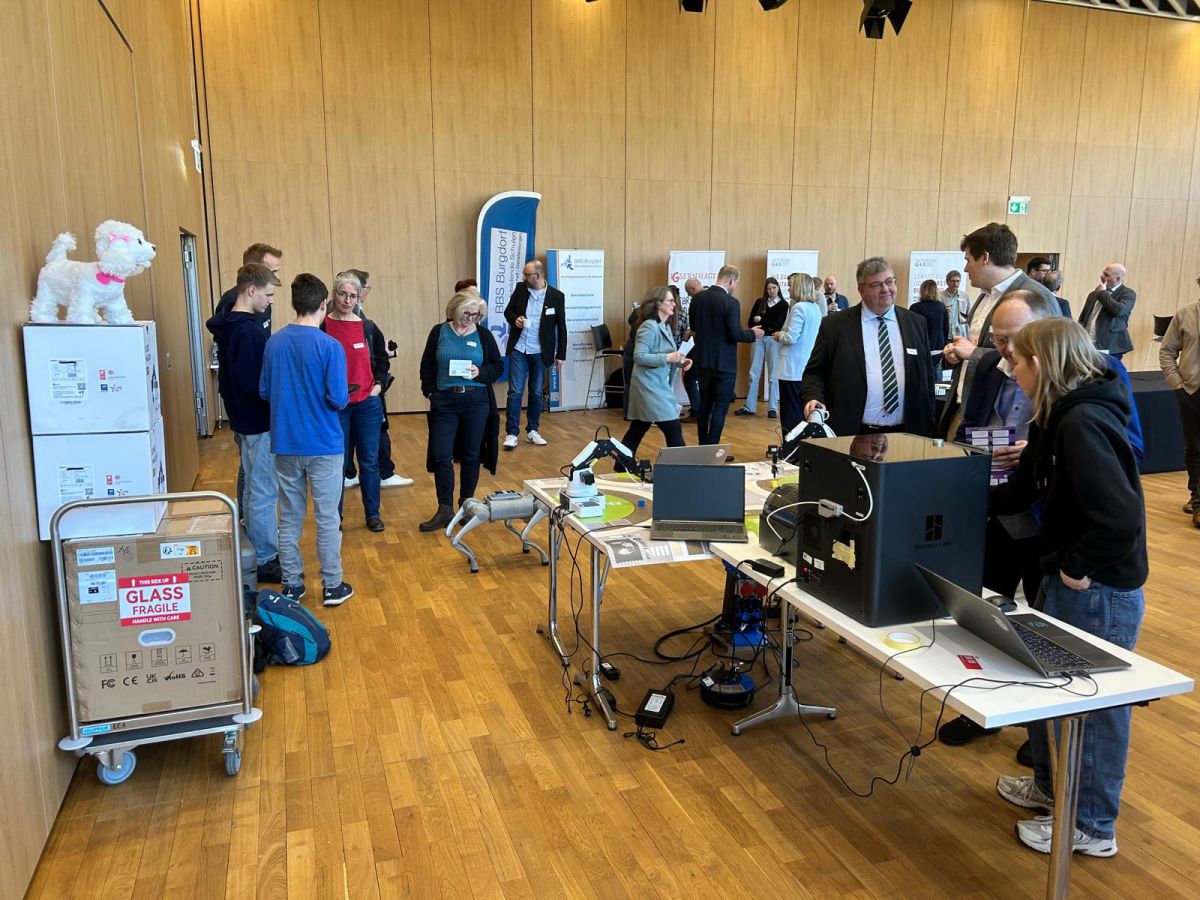 Ein weiterer spannender Teil der Veranstaltung war der „Markt der Möglichkeiten“, an dem drei Schüler unserer Helene-Lange-Schule mit innovativen Projekten und Technologien präsent war. Besonders beeindruckend für die Besucher*innen war der Roboterhund, die Dobobts sowie der Bambu Lab 3D-Drucker, die von den Schüler*innen Paul, Jari und Kjell vorgestellt wurden. Sie informierten interessierte Besucher*innen über die vielfältigen Chancen, die die HLS im Bereich IT bietet. Mehrere Besucher*innen zeigten Interesse daran, die Schüler*innen und den Roboterhund an ihre Schulen einzuladen. Darüber hinaus konnten die Schüler Visitenkarten von Unternehmervertretern und Schulleiter*innen entgegennehmen, die an einer Zusammenarbeit mit der HLS interessiert waren.