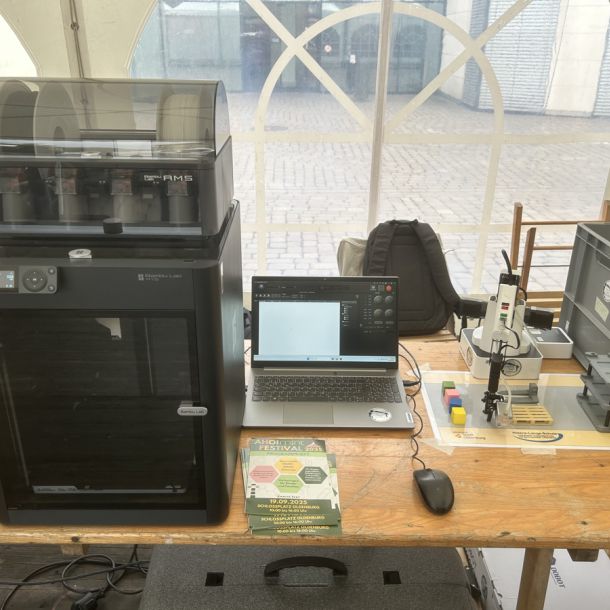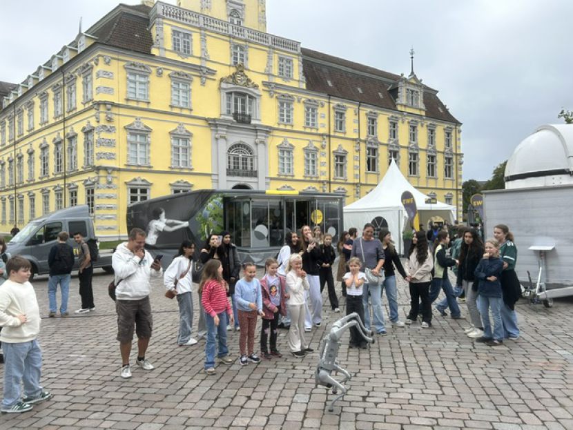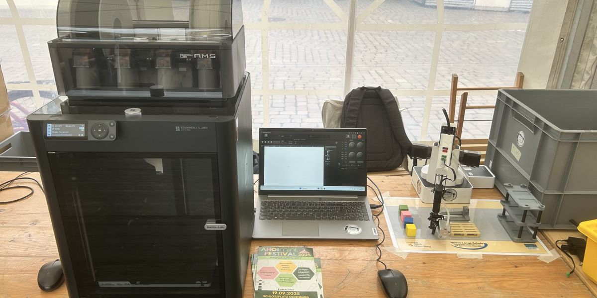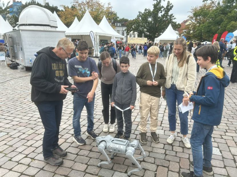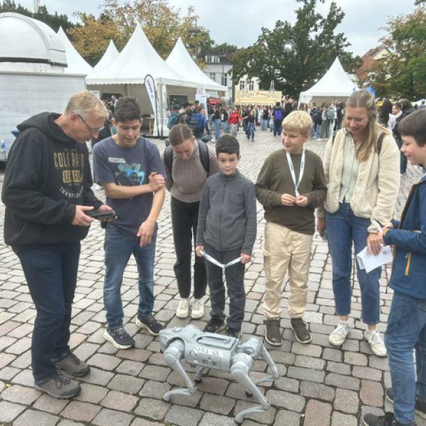 Zu sehen gab es einiges: die Dobots aus dem Robotik-Labor, LEGO SPIKEs und den Bambuleb-3D-Drucker. Viele Gäste ließen sich von den Vorführungen begeistern. Ein besonderes Highlight war jedoch unser vierbeiniger Roboterfreund Fred (UniTree Go2 Edu Plus). Mit seinen Bewegungen zog er vor allem Kinder in seinen Bann. Für Aufsehen sorgte außerdem, dass Fred auf dem Festival einen „Kollegen“ traf – einen weiteren Roboterhund der Hochschule Emden. Gemeinsam sorgten die beiden für staunende Gesichter und jede Menge Fotos und Videos. Selbst der NDR filmte eine Sequenz für Hallo Niedersachsen.