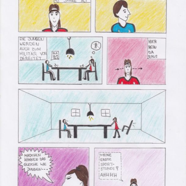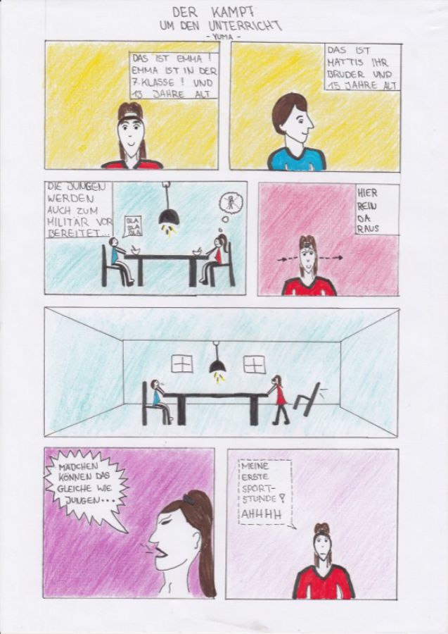 Im Kunstunterricht der 8b haben die Schüler*innen Comics geschrieben und gezeichnet. Passend zur Sportklasse geht es in allen Comics rund um den Sport. Auch die Themen Inklusion und Corona im Sportunterricht wurden verbildlicht.