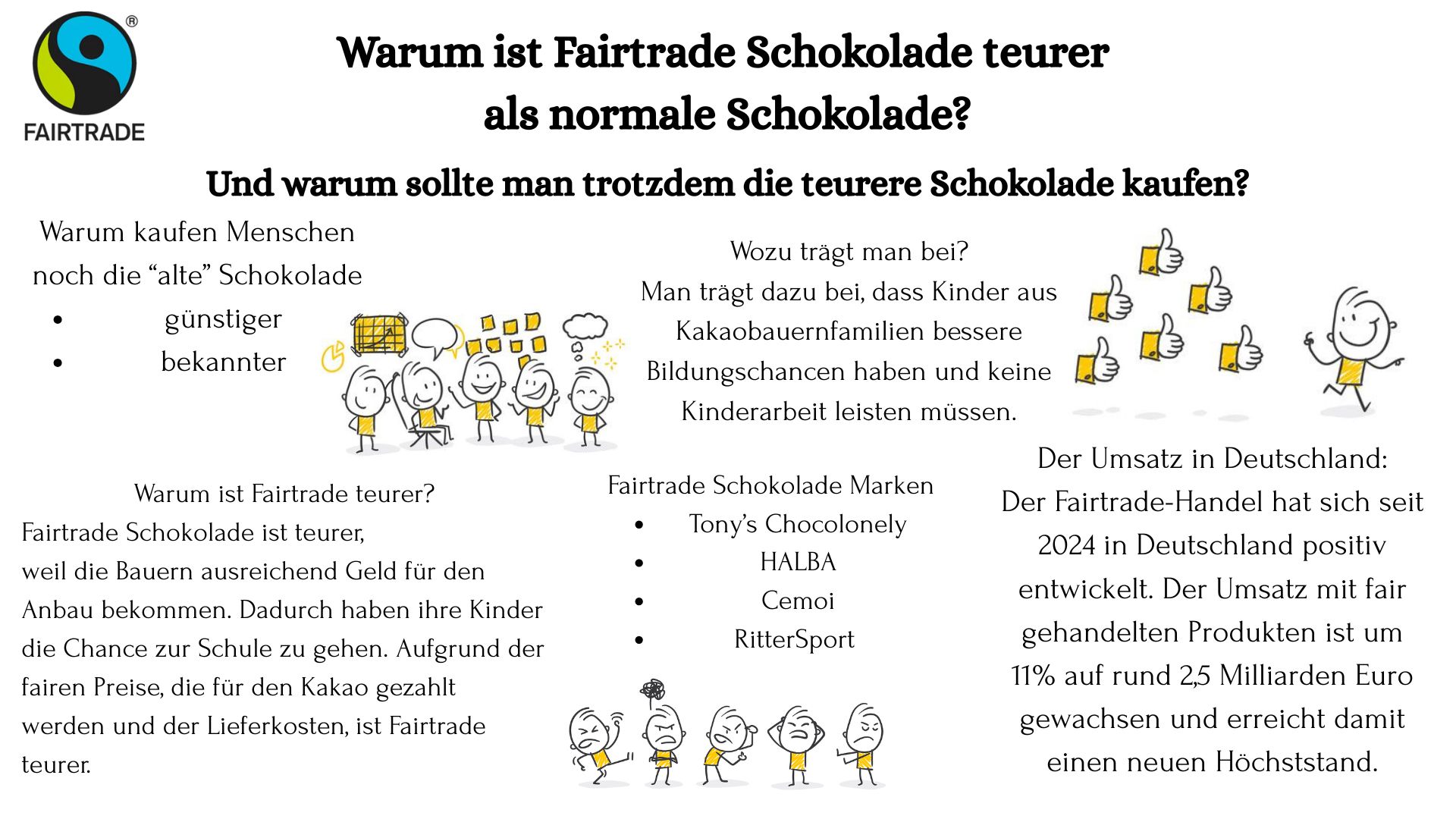 Faire Schokolade - fast jedem ein Begriff, doch bei den Wenigsten ein Griff im Supermarktregal. Kakaobauern, teils auch Kinder, die unter schlechtesten Bedingungen auf den Plantagen schuften, erhalten dafür nicht mal ein Bruchteil des angemessenen Lohns. Das ist Teil der harten Realität und sollte besonders von uns, als Umweltschule und Schule mit Courage, nicht unterstützt werden.